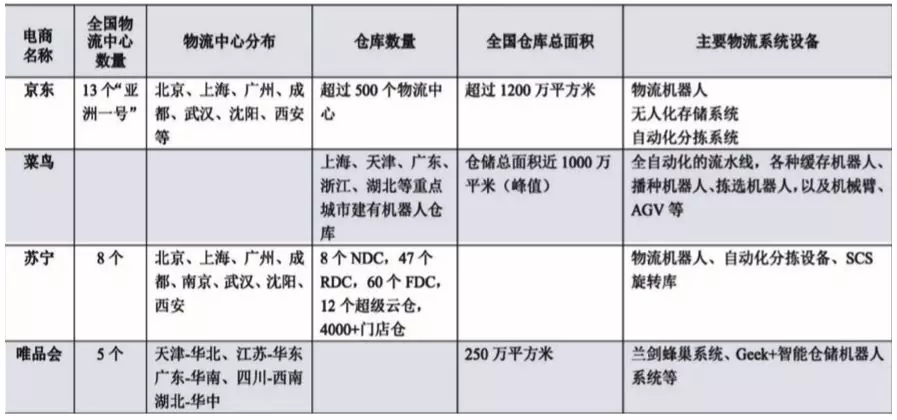 阿里、京东为首的电商巨头以物流作为其争夺行业地位的重要支撑,大力进行物流设施建设,加速物流自动化、智能化升级,从入库、存储、包装、分拣的全流程无人化成为电商物流中心发展趋势。