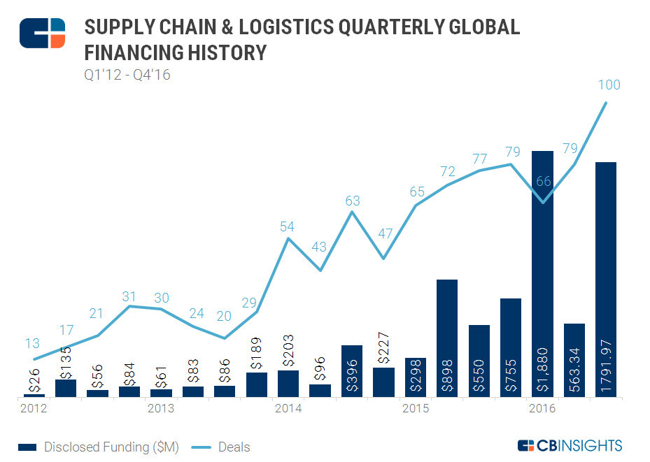 下图为分季度的供应链和物流技术行业投资趋势图。值得注意的是,2016年第一季度的投资金额创下新高,但交易数量则出现下滑。