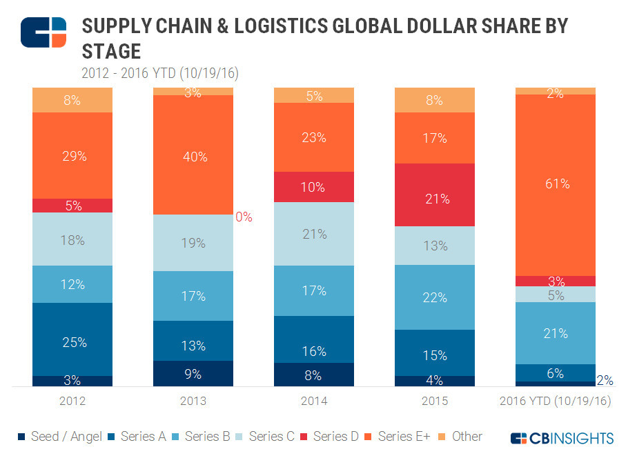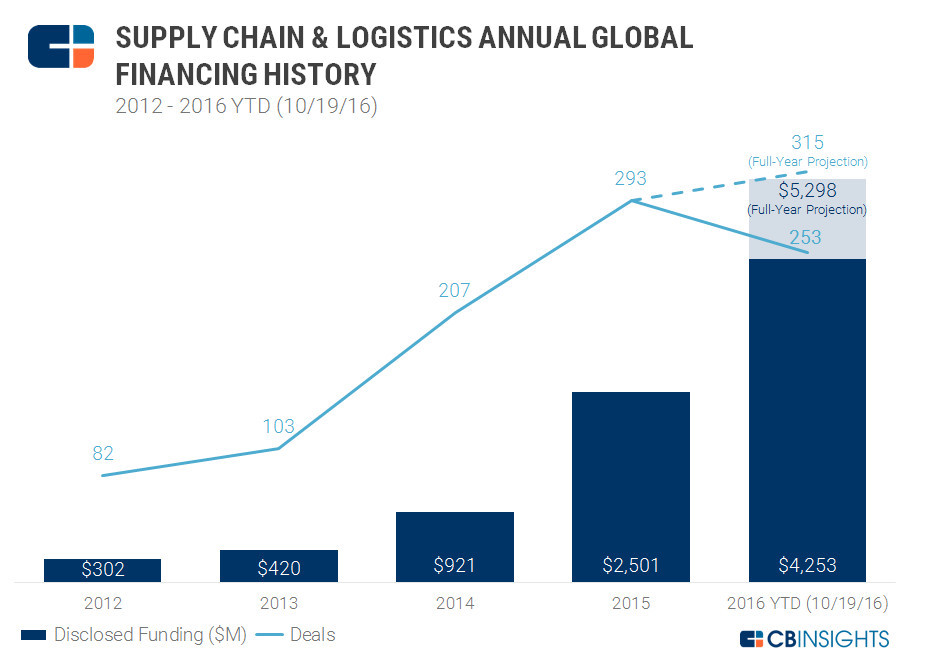 全球范围内,自2012年以来,供应链和物流技术行业共有938笔投资交易,共计8.3亿美元。2015年共有293笔投资交易,投入了2.5亿美元。2016年截止到10月,共有253笔投资交易,投入了4.2亿美元。2014年是供应链和物流技术行业起飞的一年,当时的交易数量和金额相比2013年翻了一番。