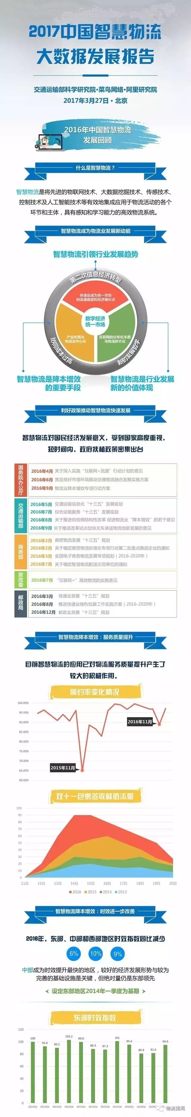 菜鸟网络与交通运输部科学研究院、阿里研究院共同编制了《2017中国智慧物流大数据发展报告》,记述和总结2016年智慧物流发展成效。为客观评价我国智慧物流的发展程度,本报告第一次提出并运用了“智慧物流大数据发展指数”这一概念,为量化评价物流行业的数据化和智能化水平做了进一步探索。