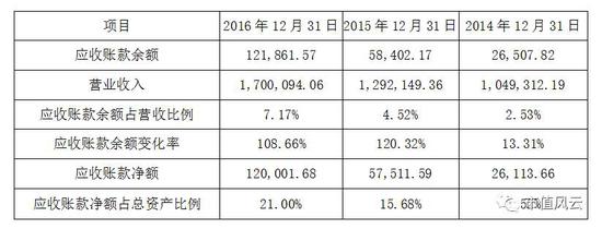 2014至2016年,德邦的应收账款余额年复合增长率高达114.41%,远远高于营收27.29%的年复合增长率,导致德邦的应收账款余额占营收比例以及应收账款净额占总资产比例都在节节攀升。