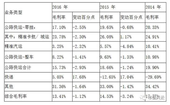 既然是零担物流老大,我们先来看其零担业务的毛利率。2014年到2016年,德邦的零担业务毛利率从20.33%一路下跌到17.1%。不要小看这几个点,对于这种营收百亿级别以上的企业,这几个点就代表了几个亿的毛利,对于这种销售净利率只有2个多点的公司来说,压力还是挺大的。