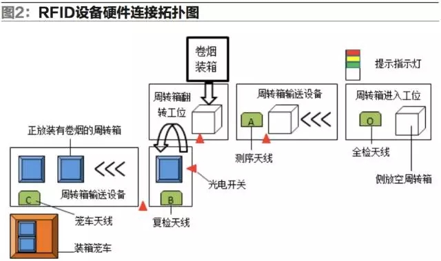 已安装RFID标签并初始化过的周转箱向卷烟装箱位置输送,在周转箱进入工位的输送设备下方(位置O点)安装一个RFID天线(全检天线)对周转箱ID号进行读取,并对周转箱的质量状态进行校验,如检测发现是后台已标记损坏的周转箱指示红灯亮,操作员需要将此破损周转箱下线;如果周转箱完好,则继续输送。