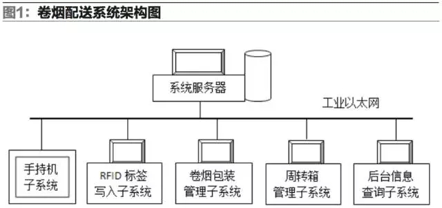 目前国内具有一定规模的烟草商业企业物流中心基本都建立了自动或半自动分拣系统,卷烟以条为单位在分拣设备上经过自动拣选后,进入包装设备进行周转箱自动装箱或裹膜打包,然后将周转箱或裹膜包有序堆叠在笼车中。卷烟配送出库时,笼车移至出库点,将周转箱或裹膜包有序堆放在配送车厢送达零售户。以周转箱为载体的配送模式,需要在卷烟送达客户后将周转箱及时回收、并返回物流中心循环使用。本系统的设计应用是建立在以周转箱为载体的卷烟包装配送模式的基础上。鉴于RFID技术的特点,在笼车和周转箱上都配置RFID标签,笼车和周转箱编上编号(以油漆喷号和激光雕刻方式),系统后台通过数据库实现编号与RFID标签唯一ID号的一一对应,实现一车一号、一箱一号。系统架构,如图1所示。