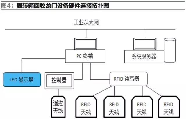 周转箱回收管理:此功能用于对每天完成商户交接的周转箱进行批量回收,同时统计每个送货组已交还周转箱的数量和待回收周转箱的数量。为了能大批量读取周转箱的RFID标签,系统设计了一个龙门RFID回收通道,该通道配置多个RFID天线、读写器、PC终端、LED显示屏、控制器和金属布等,回收龙门识别区域集中,可保证高速度、大容量采集的可靠性,能满足回收现场复杂的环境,具有良好的抗电磁干扰特性,其拓扑结构如图4所示。