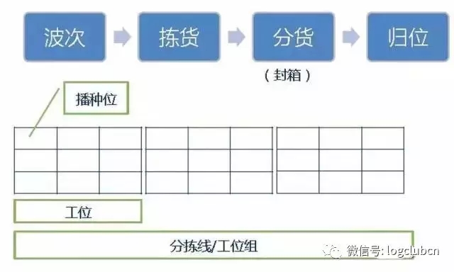 将按品项汇总拣货的波次单的货品分放到待要货的订单指定的包装箱中,称之为“分货”,又成“播种”。