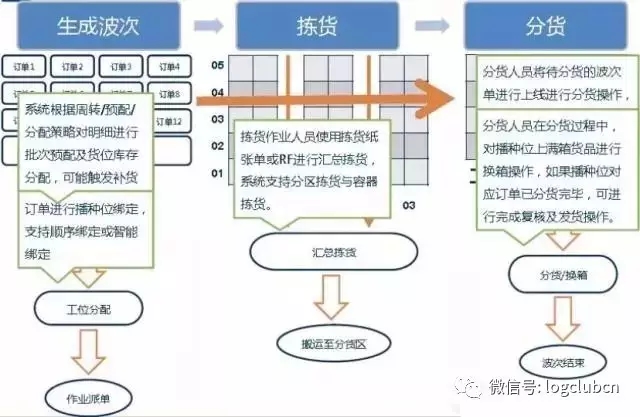 订单波次出库是把多份订单集合在一起, 先把其中每种商品的数量分别汇总拣货,再逐个的将品项按照订单要求数量通过分货设备放置到各订单的包装箱中(也成分货或者播种),又称“汇总分播”。