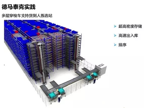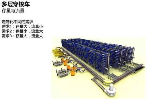第一,所有的货物都存储在自动化立体库,可以实现自动的存和出的功能,人只需要站在前面就可以了。根据系统需要,把相应箱子从立体库里调出来,放在人的面前。多层穿梭车系统主要的功能是支持货到人拣选,还有一些辅助功能,比如说超高密度存储;