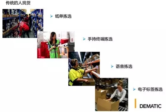 第一代是纸单拣选,也就是人拿着纸单,上面写着拣什么货、拣多少、去那里拣,然后走过去进行拣货;后来出现了手持终端技术,手持终端已经把纸单代替,但也是通过屏幕显示告知操作员到哪里拣什么货、拣多少;随着语音技术的发展,操作员把双手解放出来了,只带一个耳麦就可以进行拣选了,通过声音告诉操作员相关信息。然而,我们有了电子标签,通过灯光的闪亮提示操作员,并通过数字显示的形式告知操作员拣选内容……这些传统的拣选方式,无论用什么样的技术,其实都是需要人去找货的方式来完成。