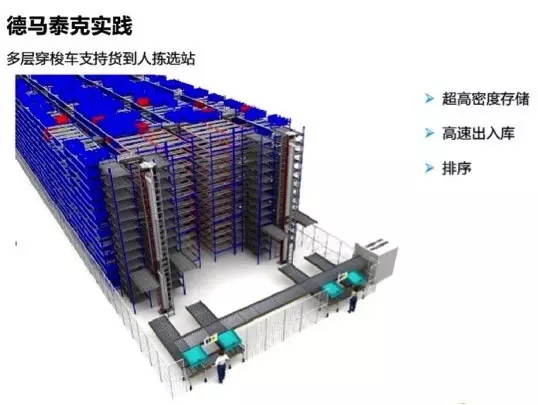 德马泰克最新的多层穿梭车,也是世界上最先进的多层穿梭车,从结构上讲分四部分,在巷道里面有不同的层,每层都有一个车,然后有一个货架输送机,连接小车,最后一部分就是货架,由于每层都有一个拣选小车,从而实现了高速出和高速入的流量。这个技术多年前在欧美已经使用,近年来德马泰克在中国也开始广泛推广,今年年初在济南有一个项目已成功落地。该项目实现了每个巷道500个箱子出、500个箱子入的流量。