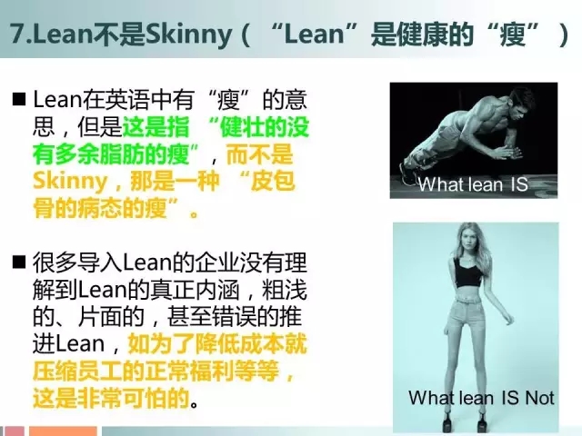 Lean在英语中有“瘦”的意思,但是这是指 “健壮的没有多余脂肪的瘦”, 而不是Skinny,那是一种 “皮包骨的病态的瘦”。