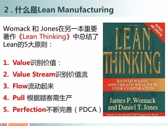 那么什么是Lean Manufacturing呢? MIT的Womack and Jone基于TPS的范本定义了Lean的5大原则,供参考: