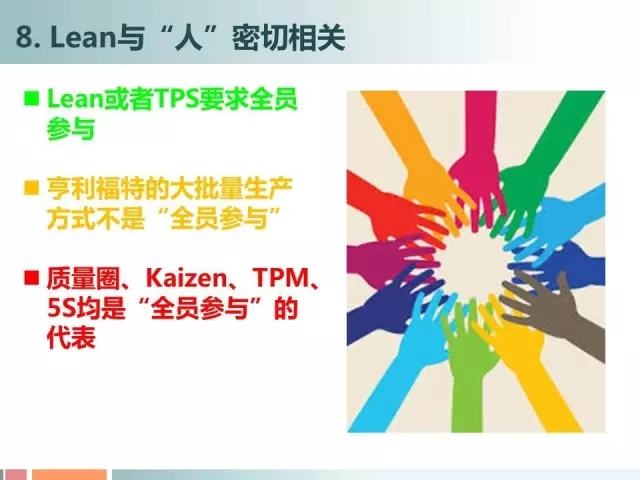 丰田以及其他日本企业就看的很明白了,所以他们选择了另外一种理念,即朱兰、戴明等质量先驱倡导的基于所有员工参与的改善----这种理念在今天的ISO 9001的质量管理7大原则中就占了两项(Engagement of people & Improvement)。在此理念下,从质量圈到Kaizen,到TPM,再到5S无不体现了全员参与。