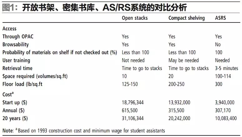 在Oviatt图书馆,AS/RS成为名副其实的低成本解决方案。比如开放书架中每册书每年的维护成本大概4.26美元,而在AS/RS中其成本仅为0.86美元。开放书架的好处在于读者可以随意浏览和翻阅,但是占用的空间太多;密集式书架虽然也能浏览,但是需要读者操作和移动系统,不够方便。很多图书馆不愿意考虑AS/RS的原因在于它不允许读者浏览。在使用AS/RS系统两年后,Oviatt图书馆从空间利用、安装成本、维护成本、易用性、存取时间等方面对开放书架、密集书库、AS/RS系统进行详细的对比分析,详情见图1。