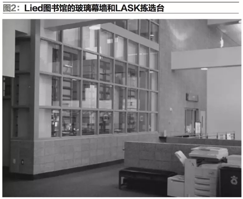 在要求图书馆容纳的180万卷典籍中,AS/RS系统需要容纳120万卷。如果以每年3万卷的速度增长,这可以满足未来40年的扩展要求。但是当时的预算无法支持6巷道的自动化存储系统,所以最后安装了3巷道系统。由于AS/RS和流通台毗邻,所以没有安装ETV小车。图2显示了Lied图书馆的玻璃幕墙和LASK拣选台。