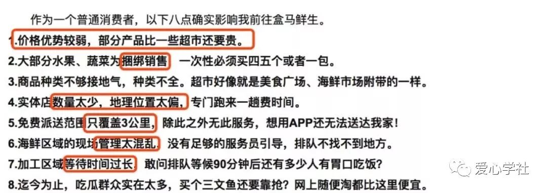 近日,有自媒体发文指责盒马线下服务差,货品过期管理不善,甚至因此对新零售表示失望。其实,盒马线下店的服务被用户和媒体诟病已久,并不是什么新鲜事儿。《爱范儿》此前曾评价盒马线下店体验“如抽丝般杂乱而消耗耐心”,中国政法大学特约研究员就曾专门撰文指出:(盒马)就餐环境与消费价格不成正比,确实如个别用户所言“去了一次就不想再去了”。