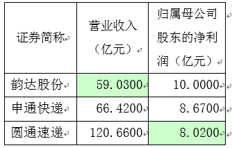 申通快递在营收高于韵达7个多亿人民币的基础上,净利润被反超,且营收增速最低,不足20%。圆通的营业收入虽仍位于通达系之首,但营收几乎翻倍于韵达快递的情况下,净利润仍低于韵达快递,盈利能力堪忧。