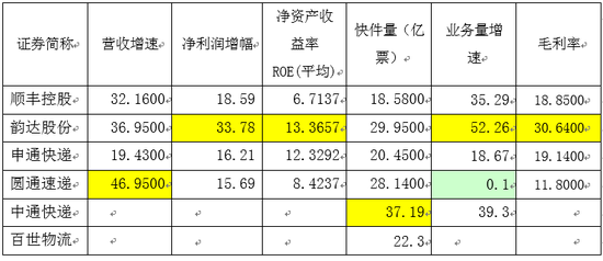 新浪财经对快递业6家上市公司,包括A股上市公司顺丰控股、韵达股份、申通快递、圆通速递及中概股中通快递和百世物流。其中,有些比较因数据披露原因,中通快递和百世物流未涉及。仅供参考。