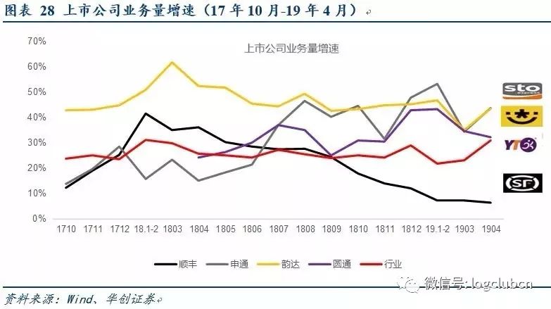 2019年更为明显,龙头增速远超行业,1-4月累计增速看申通(44.8%)>韵达(42.1%)>圆通(37.2%)>行业(24.8%)>顺丰(7.1%)。