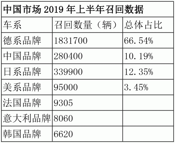 另:质量稳定性。根据数据统计,在2018年国内新能源汽车召回13.8万台,涉及到了7家厂商,召回率约13%。2019年上半年,中国市场累计被召回车辆达到275.29万辆,相比去年同期下降42.96%。其中德系品牌占据比例最大,其次则为日系品牌。而在中国品牌召回数量达到28.04万辆,不过仅猎豹CS10就一次性召回14.7万辆,这就导致上半年整体召回量相比去年同期有所上升。