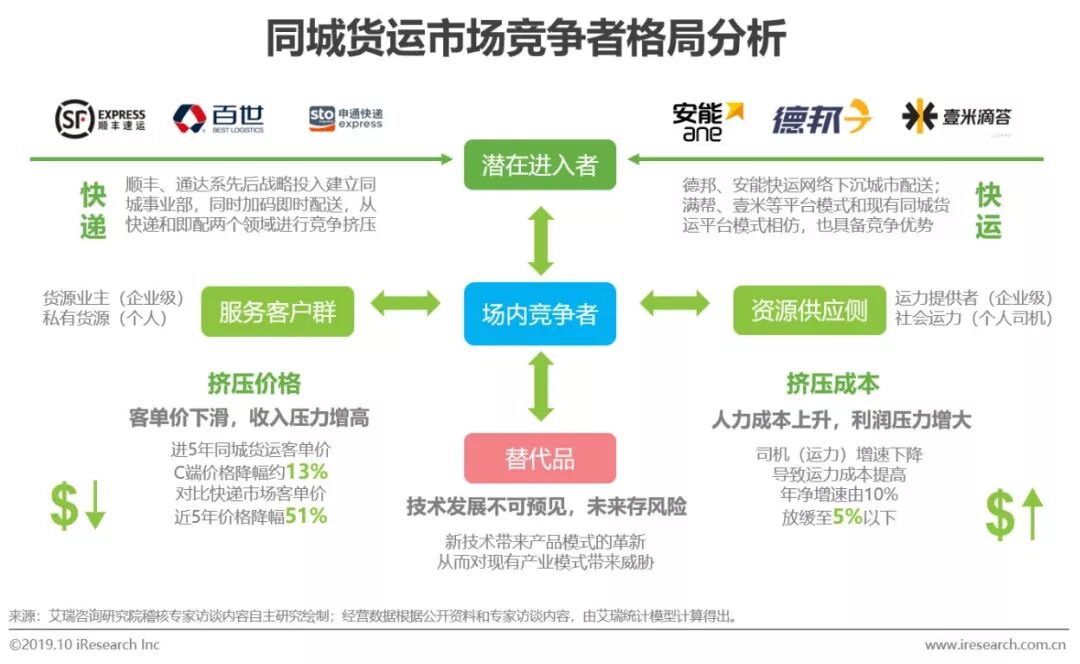 竞争者:外部受市场挤压,内部迎巨头进场随着新技术的涌入,越来越多的物流场景在标准化细分之后呈现出融合的态势,同城货运市场中的竞争者不仅需要面对来自客户和运力供应端的压力,还要去面对来自跨领域物流巨头进入市场所带来的冲击。