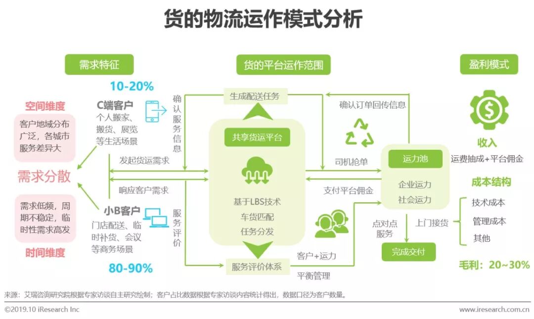 运营模式:C端临时性需求衍生灵活的货的模式,痛点在于需求分散C端业务模式主要服务小B客户和散客,非计划性需求占比很高。企业基于LBS技术,通过搭建共享货运平台来实现客户需求和运力最优匹配。由于其客群分散,黏性低、需求频率不稳定等特征,在保障物流服务信息实时传输的同时,需要兼顾服务评价体系和售后客情管理,能够确保和收派两端的客户交互,最大程度优化服务质量。盈利模式上主要以收取佣金的方式实现。
