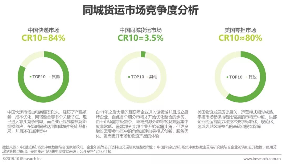 竞争格局行业集中度低,市场竞争离散化,升级空间可观沙化的市场需求和地方品牌林立导致短期内仍无法在市场上出现有绝对领导力的巨头。未来,随着区域市场不断扩张,企业加速在垂直领域的渠道管理,市场会稳步但慢速的聚合。对比国内快递市场的高度集中以及同质化竞争,同城货运市场未来的竞争方式仍是以局部的、垂直行业内的竞争为主。直到出现革新性的技术或平台,解决当前市场沙化需求分散的痛点之前,行业的离散竞争还将持续。