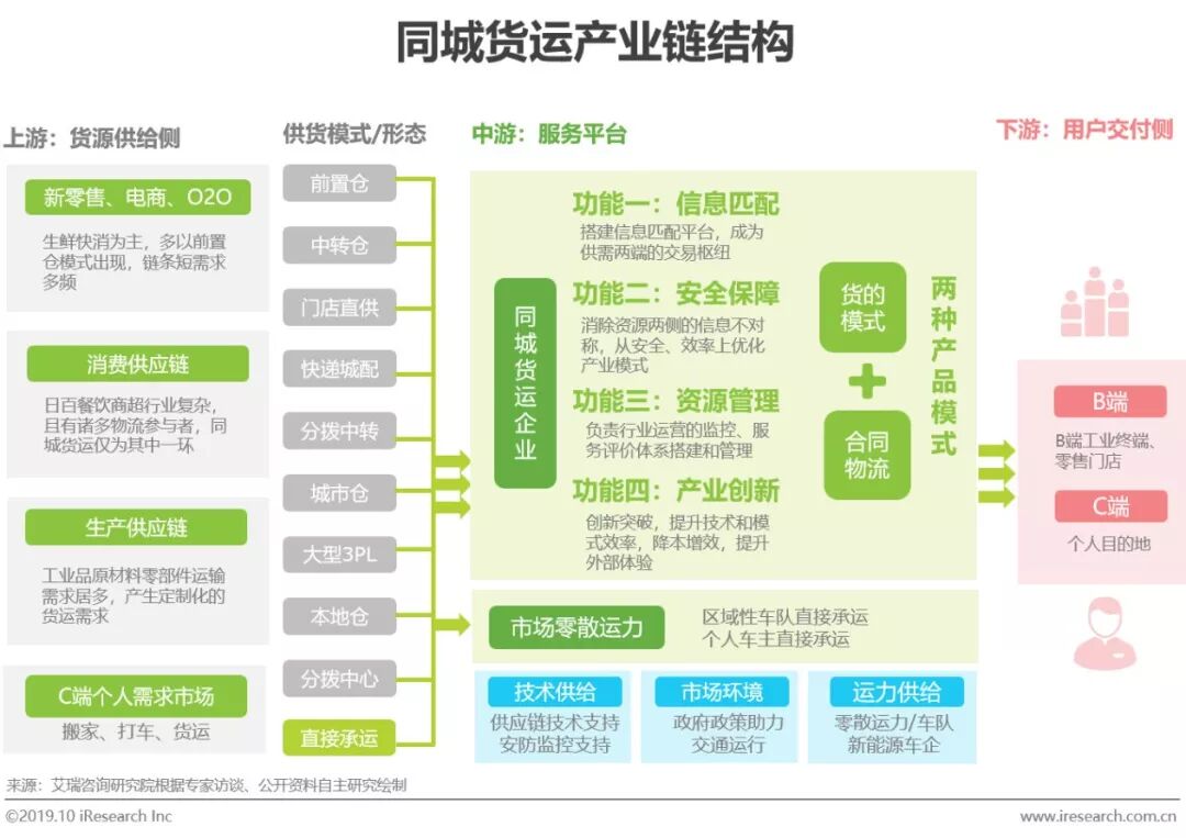 从供应链物流结构来看,同城货运从属于运输配送环节,按照地域维度划分从属于同城配送业务,从货物类型维度划分从属于货运(相对快递)业务,因此本次研究的范畴即为同城市内大中型货物的运输物流业务。
