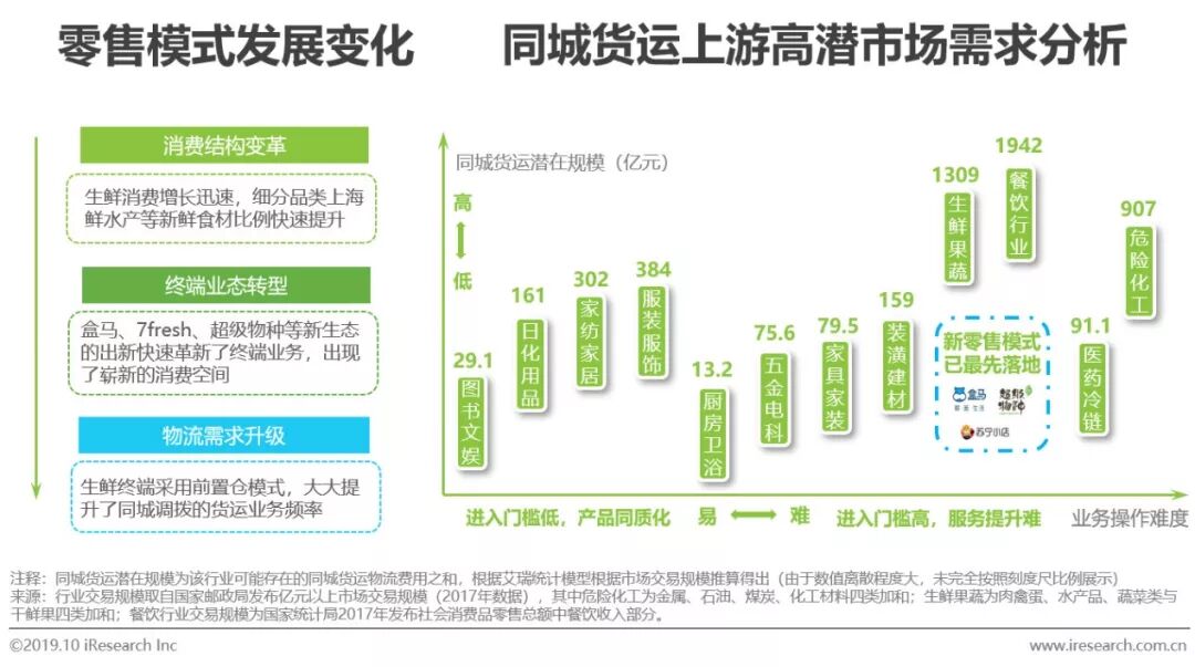 新零售模式的兴起,重塑供应链的同时也在持续的为同城货运市场注入新的增长活力;消费结构的转变为特地的领域带来巨大增量,零售巨头通过布局城市基础零售设施革新了传统的终端消费形式。新的终端业态几大的提升了城配物流的使用频率,使得众多货运公司在垂直整合和服务升级上迎来新的机遇。