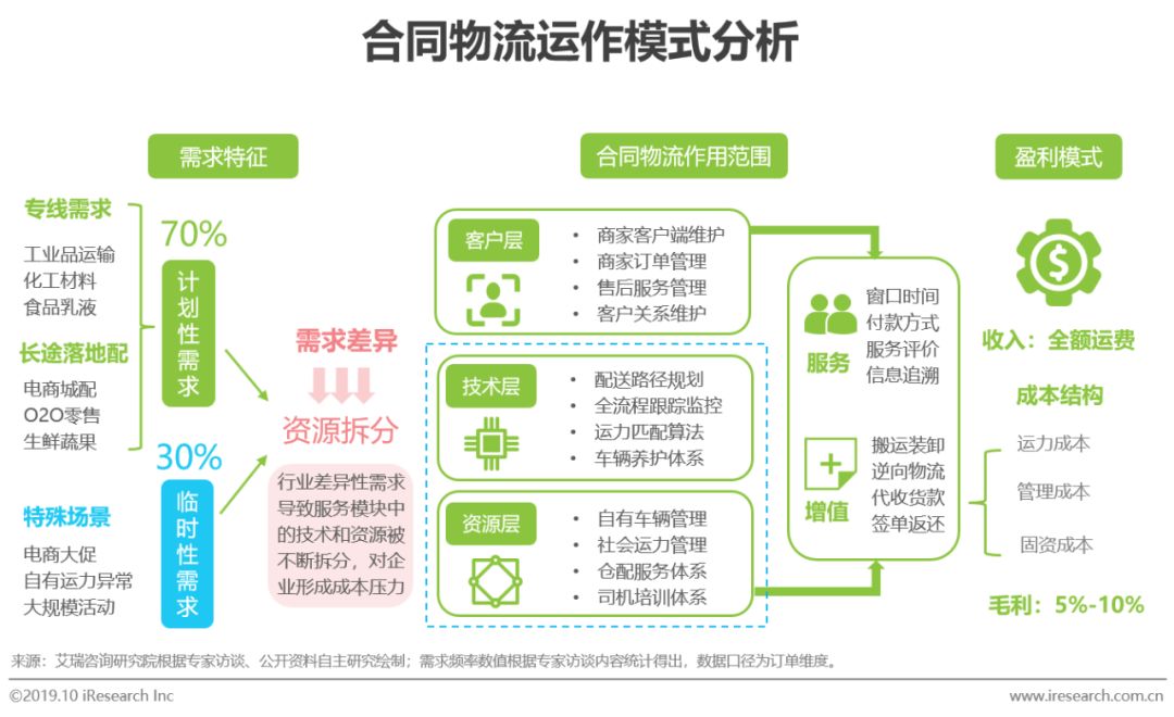 运营模式:B端稳定的需求供给催生合同物流模式,痛点在于需求差异化B端的城配本质上类似传统的流通物流,客户的个性化要求高,服务非标,且多SKU、多环节操作,不同于快递快运的简单标准化运作,不同品类间的物流要求有专业化壁垒。市场多以计划性需求为主,对时效服务等标准要求低于快递。合同物流能为供需双方带来稳定的业务合作方式,提高运作效率,成为诸多B2B企业和上游需求企业的重要选择。