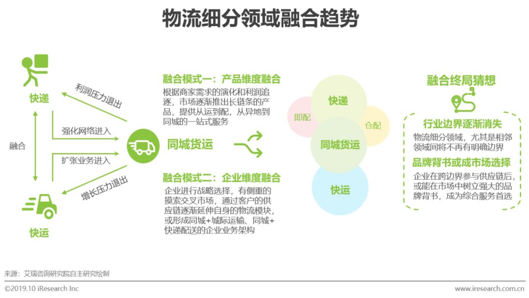 新边界:融合发展加速行业优胜劣汰物流市场宏大复杂,但诸多相邻业务又具备一定的同质化特性,同城货运与其他运输配送环节的融合发展,将会加速行业内的竞争压力,快速洗牌或能过滤出优质的产品模式和强大的货运巨头。市场通过产品融合和企业战略拓展两种方式来加速融合,无论是同城货运行业内部还是其他物流企业,都具备基本的竞争能力和融合条件。未来相邻行业的边界或将不在明细,取而代之的是综合性物流企业用强大的供应链能力来拿下新市场。