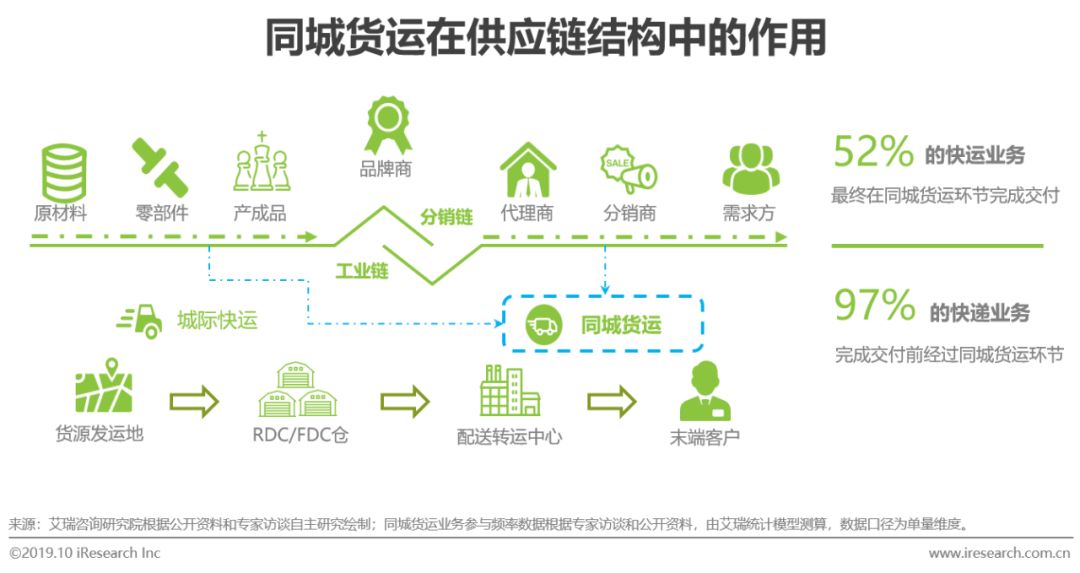 城配属于”最后一公里”配送,“一公里”并非指距离近,而指离用户更近。最后一公里之所以能成为物流行业持续性探讨的复杂课题,是因为它是物流长链条中唯一能直接触达最终用户的环节。某种意义上讲,同城货运的交付质量决定了整个供应链的交付质量,因为它是客户评价服务导向最重要的动因之一。在供应全链条的工业生产和分销环节,都会有同城货运的业务存在。