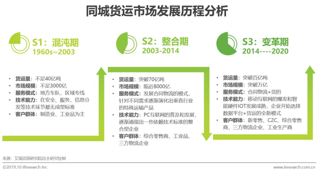 发展历程互联网技术应用系推动产业发展的最大动因在互联网技术尚未成熟普及之前,同城货运市场经历了较为漫长的混沌发展时期,一方面未形成较大的市场规模,另一方面收到市场需求沙化的特征,也没有出现爆发性的适配技术和普适的行业标准;进入互联网时代以来,跨领域的技术快速渗透物流行业,同城货运市场也受到资本和巨头眷顾,在技术领域的巨大突破下形成了全新的商业模式和市场结构。未来,更多的智能技术将持续性赋能行业,催生更大更彻底的变革。