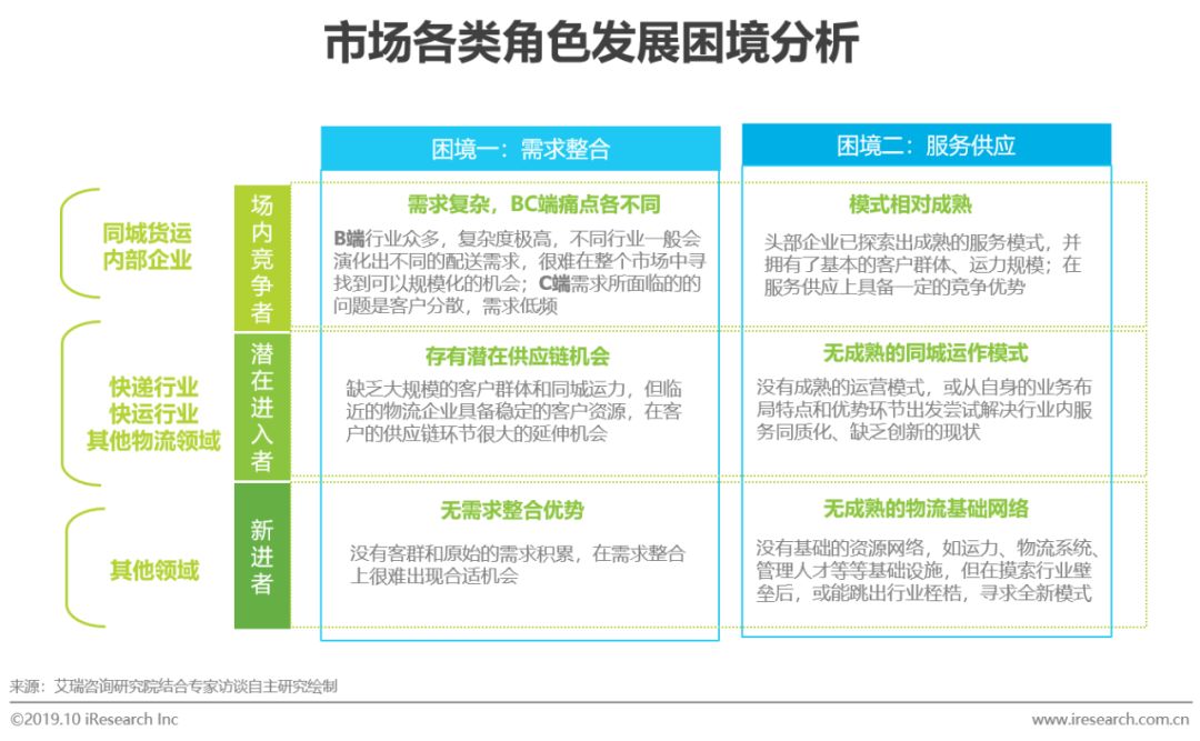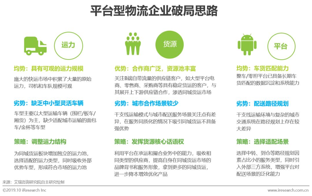 干支线运输平台与零售商、综合物流服务商在供应链上有紧密合作,同时他们之中的多数也已具备数据中台能力,对于突入同城货运市场有一定的产品基础,但要想抢占更多的机会,保持健康增长,需要尤其关注货源点上的竞争能力,弥补自身运力和系统的差异不足。