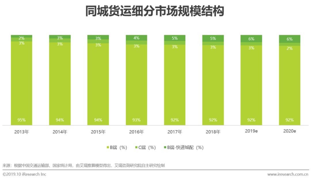 市场规模未来超万亿级的市场体量在物流行业稳定增长的背景下,同城货运市场也迎来了发展黄金期。近年来规模增速有浮动变化,但整体仍呈上升态势,未来3-5年预计仍将保持5-7%的增长速度,在2020将市场规模将突破万亿。细分市场结构方面,C端业务规模较小但发展稳定,B端快递城配业务受电商快递热潮迎来飞速增长,B端业务作为同城货运的基本模块有着超过90%以上的稳定份额。