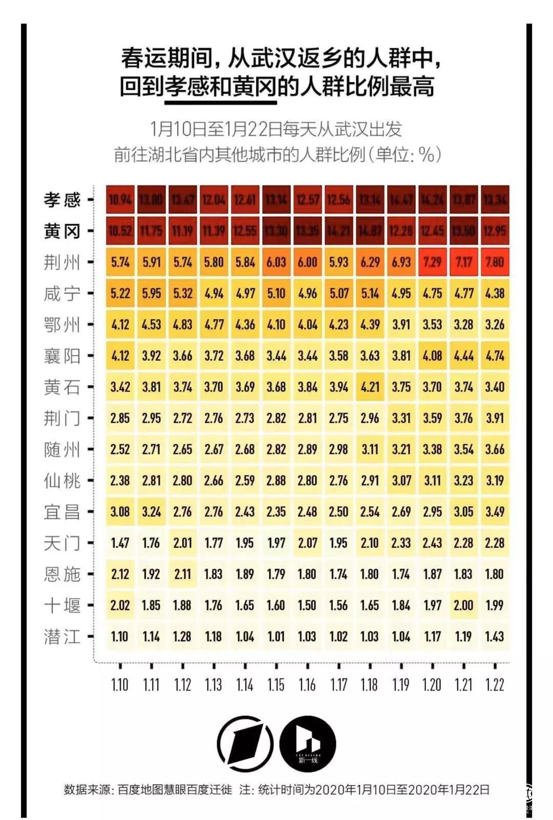 第一财经·新一线城市研究所引用百度地图慧眼的迁徙大数据也显示,1月10日至1月22日春运期间(武汉封城之前),每天从武汉出发的人群中有6至7成的人前往了湖北省内的其他城市,其次是河南省、湖南省、安徽省、重庆市、江西省。