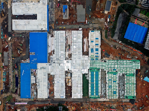 在武汉火神山、雷神山医院建设中,基于北斗卫星导航系统的高精度定位设备火速驰援,确保工地大部分放线测量一次完成。这是无人机拍摄的武汉火神山医院。记者 李贺 摄