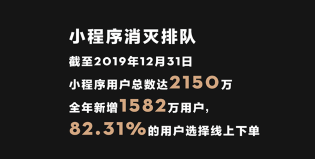 为解决排队问题,喜茶倾力打造HEYTEA GO小程序,上线后不仅缓解了排队问题,短时间内复购率迅速上涨3倍。据喜茶提供给投中网的数据,截止2019年12月31日,小程序用户已达2150万,2019年全年新增1592万用户,82.31%的用户都选择线上下单。