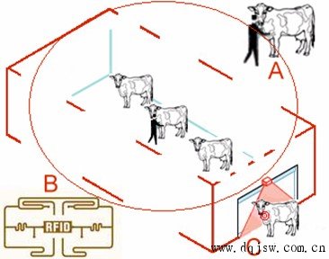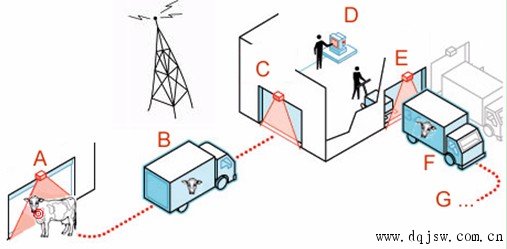 上面所说的情形可以用物联网项目中的实际案例来说明。让我们来观察图2,这是现实世界中的一个例子,牲畜(A)由标签(B)来识别,成为物联网(C)中的一个数字对象。此后,业务的各种计算就可以用数字对象来处理了。