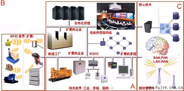 "传统"的世界用组件(A)表示,包括传统产业、扩展的和分布的企业,一般的员工、家庭、能源设施、网格、服务和其他现实业务。对前面现实业务扩展的新使能和新出现的技术包括在组件(C)中,包括形式化认知过程、业务智能(BI)、机器推理、语义Web、自动决策支持和其他应用技术。这是无线扩展到将来无人世界的景象,其中自动化智能可能管理着一切:物理对象和非物理实体(流程),多个部分的现实世界或者数字世界。组件(B)表示了使用RFID可能产生的景象,RFID是无线科学和技术的一部分,把现实生活成员转换成数字形态,准备进入物联网。