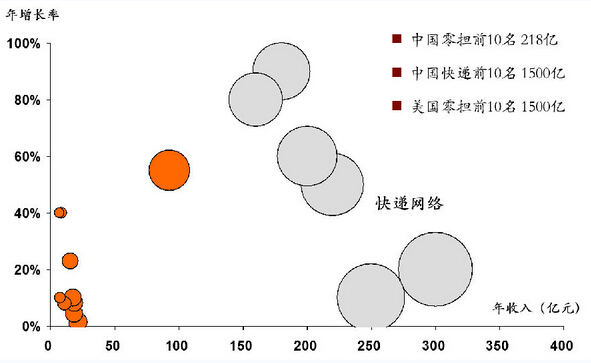 我们先来简单看看行业总体的现状,如上图,横轴是营业额,竖轴是增长率,橙色的是所有零担网络企业,最大的橙色圈代表的是德邦,其他的零担货运企业都在左下角,意味着规模小、营业额少、增长不高,华宇、佳吉相对来说虽然排名靠前,但营业额也只有20亿左右,增长非常慢。