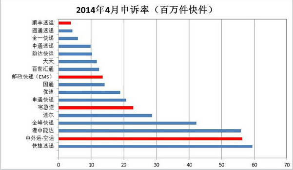 很多人说加盟不靠谱,对土老板的管理会失控。我们拿快递行业的例子来做类比,上图是2014年4月份国家邮政局对所有快递公司投诉率的排名,红色是直营企业,蓝色是加盟企业。可以看到直营企业投诉率参差不齐,加盟企业的与顺丰非常接近的是圆通,全一、中通、韵达紧随其后,申通比韵达差一点。