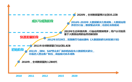 自2012年开始,全球大数据发展迎来快速增长时代;所运用到的行业更为广泛,可信数据量更加丰富,用户认可度更高;到2020年,大数据的解决方案将更加成熟,信息社会智能化程度将大幅提升。