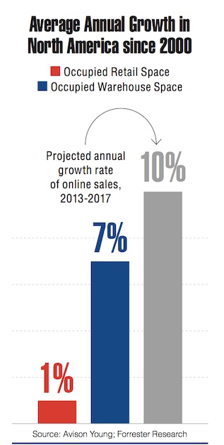 亚马逊、沃尔玛等一些公司正在抢购仓库空间,网上购物热潮推动了仓库建设与房地产投资信托基金。亚马逊物流中心,比如英格兰彼得伯勒,城市繁华地段与交通便利周围的仓库需求正在增长。