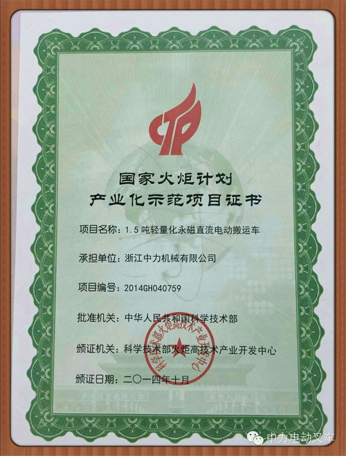 近日,中力荣获了2014年国家火炬计划产业化示范项目证书。中力《1.5吨轻量化永磁直流电动搬运车》项目立项,这是国家科学技术部对中力产品的肯定,也是对中力研发团队的创新能力的认可。