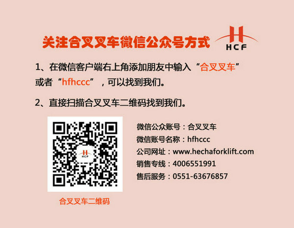 合叉叉车微信公众号正式上线啦!广大员工和客户可以通过搜索“合叉叉车”或者直接搜索微信号“hfhccc”找到我们。