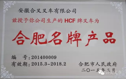 经过行业主管部门推荐,专家组综合评价,市质量工作联席会议审议通过并经社会公示,安徽合叉叉车有限公司HCF牌叉车被评定为2014年合肥名牌产品,受到合肥市政府通报表彰。