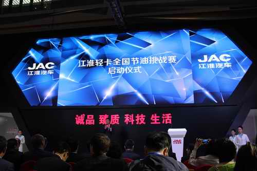 在车展现场,江淮轻型商用车还发布了江淮轻卡节油挑战赛启动仪式,并由中国物流学会常务副会长戴定一向项兴初总经理授旗。“空气污染问题突出,以实际行动践行低碳环保已成为江淮人的共识,汽车作为耗能大户,节能减排势在必行。正因如此,我们的产品研发工作也始终将产品的燃油经济效益作为重要一点进行考虑。而今天的节油赛事也正是江淮轻型商用车注重环保、推广节油科技的务实体现。”江淮轻型商用车相关活动负责人介绍到。