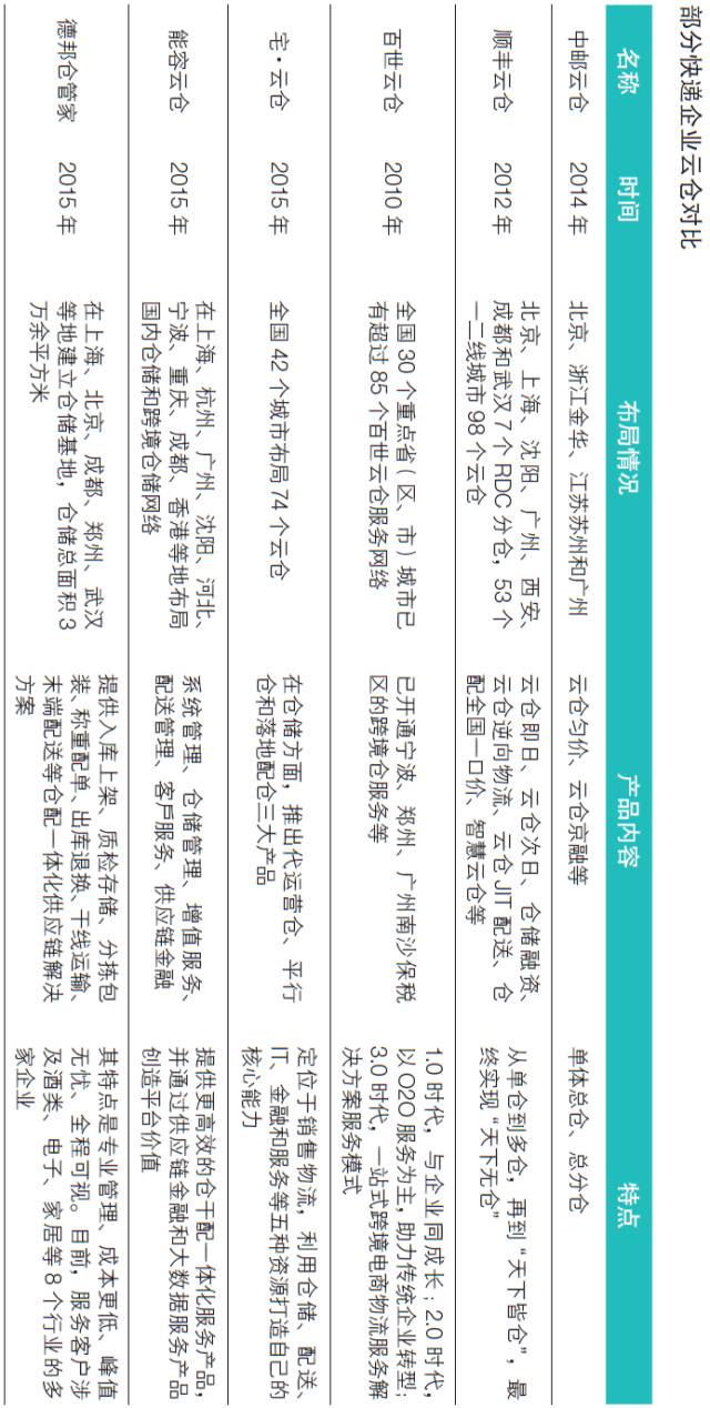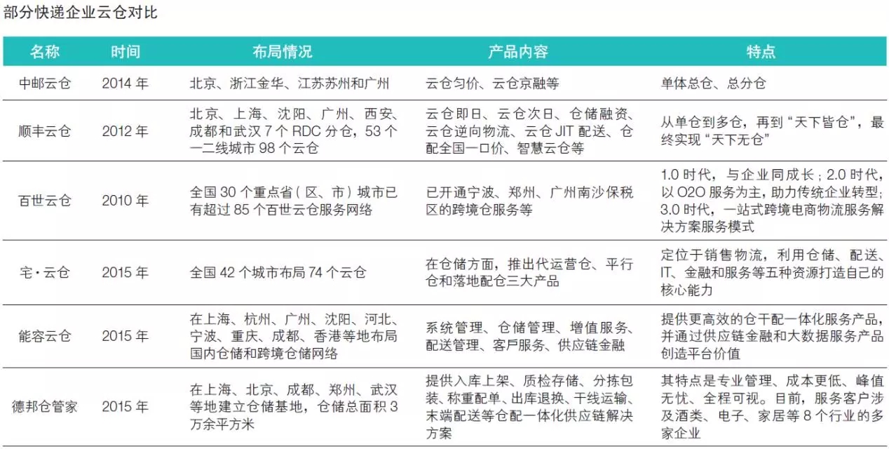 细数目前明确提出云仓产品的快递企业,中邮速递、顺丰、百世、宅急送、天天、德邦等均位列其中。各家企业从自身战略出发,描绘出一幅有关云仓的多彩图。