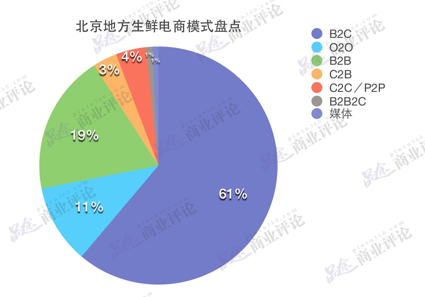 看完数量再来看模式,在品途商业评论盘点的这121家生鲜电商中,主要商业模式为B2C的有74家,占比约为62%。紧随其后是B2B的模式为23家,占比约为19%。数量排第三的是拥有线下自提点或前置仓的O2O模式,数量为13家,占比约为11%,其余的模式主要为C2B、C2C、P2P,以及B2B2C和生鲜垂直媒体。除C2B模式数量有4家外,其余数量均在1~3家左右徘徊。(单个生鲜企业模式分类详情可下拉至文尾部查看图表。)